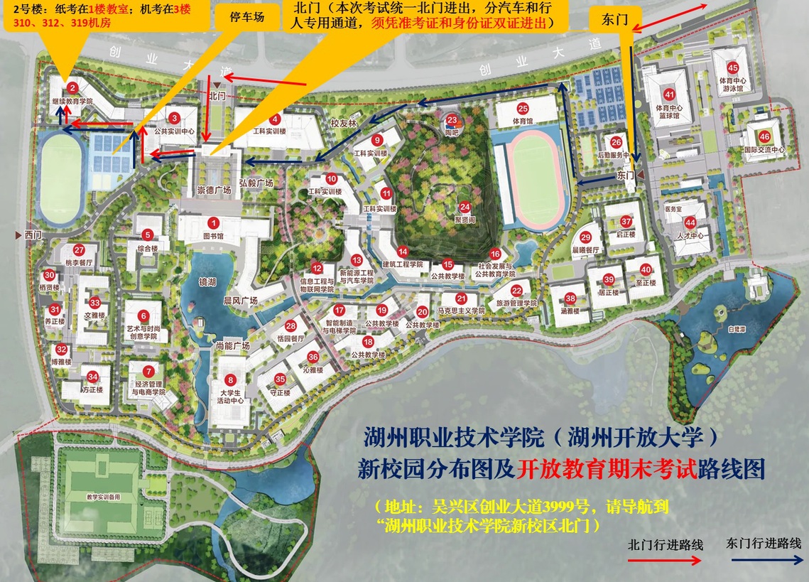 3.湖州开放大学老校区(学府路299号)已不启用,目前已经整体搬迁至创业大道3999号新校园,请第1考点考生和23考点参加机考的考生切记不要走错,考生统一从学校北门进出(导航至“湖州职业技术学院新校区北门),未提前预约入校申请考生须出示准考证和身份证方可进出。